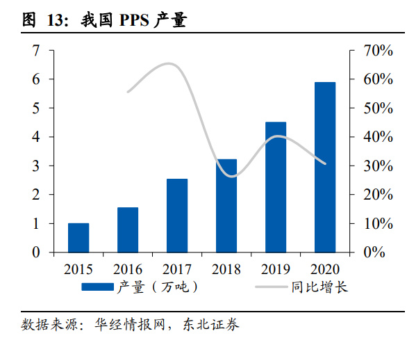 受益于新能源汽車等新興領域的發展,PPS 需求持續增長。在汽車輕量化大勢下, PPS 可作為金屬材料替代品,廣泛應用于新能源汽車 HVAC 系統、控制系統、傳感 器、發電機和驅動電機組件以及電池組件等。傳統汽車上的 PPS 用量為 700g,而在 新能源汽車上 PPS 用量達到 2500g(1800g 用在 HVAC+700g 其他應用)。我國 PPS 需求量持續增長,從 2015 年的 2.05 萬噸增長至 2020 年的 6.35 萬噸,CAGR 為 25.37%。