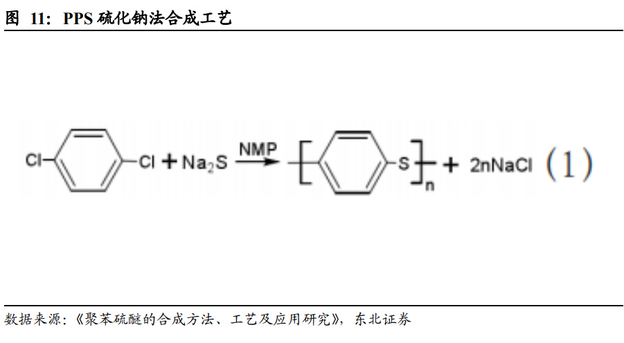 聚苯硫醚(Polyphenylene Sulfide, PPS)是指主鏈由亞苯基與硫原子交替連接所形成的聚合物,分子內化學鍵結構高度穩定,形成具備熱穩定性的晶體點陣結構,因而 對熱降解與化學反應不敏感。分子鏈內苯環剛性與硫醚鍵柔性兼備,易于結晶,結 晶度可達 75%,熔點 285℃。PPS 具備優異的耐熱性、耐化學腐蝕性、阻燃性、突 出的電性能、高剛性、尺寸穩定性、熔融流動性等獨特性能。根據分子量的高低, PPS 樹脂可以分為高分子量、中分子量、低分子量樹脂;按照結構組成可分為線型、 支鏈型以及改性樹脂(共聚、嵌段、交聯、接支等);根據用途的不同,PPS 樹脂又 可分為涂料型、注塑型、纖維型、薄膜型等。 PPS 的合成方法較多,最主要的工業化生產方法硫化鈉法(Phillips 法)。PPS 合成 方法有硫化鈉法、硫磺溶液法、氧化聚合法、對鹵代苯硫酚鹽熔鹽或溶液自縮聚合 法、硫化氫法、二苯基二硫醚合成法等,主流合成工藝為硫化鈉法。硫化鈉法反應 原料主要為無水硫化鈉 Na2S 和對二氯苯 p-DCB, 反應物在堿金屬做催化劑作用下, 在強極性有機溶劑中在一定的溫度、壓力下通過縮聚反應得到高分子量的 PPS。