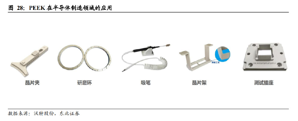 半導體制造領域里,PEEK 可用于制作多類工具。化學機械研磨(CMP)是晶圓生 產過程中一項關鍵性制程技術,CMP 固定環是用來在研磨過程中固定硅片、晶圓, 選擇的材料應具有良好的耐磨性、尺寸穩定、耐化學腐蝕、易加工。PEEK 是非常 適合的材料。晶圓載具一般采用耐溫、機械性能優異、尺寸穩定性以及堅固耐用、 防靜電、低釋氣、低析出、可回收再利用的材料,PEEK 可用于制作一般傳輸制程 用載具。PEEK 還可以用來制備夾取晶圓或硅片的工具,如晶片夾、真空吸筆等。 夾取晶片時,要求所采用的的材料不會對晶圓的表面產生劃痕,無殘留物,保證晶 圓的表面潔凈度。PEEK 具有耐高溫、耐磨性、尺寸穩定好、低釋氣性以及低吸濕 性等特性,不會對晶圓、硅片的表面產生劃痕或污染。